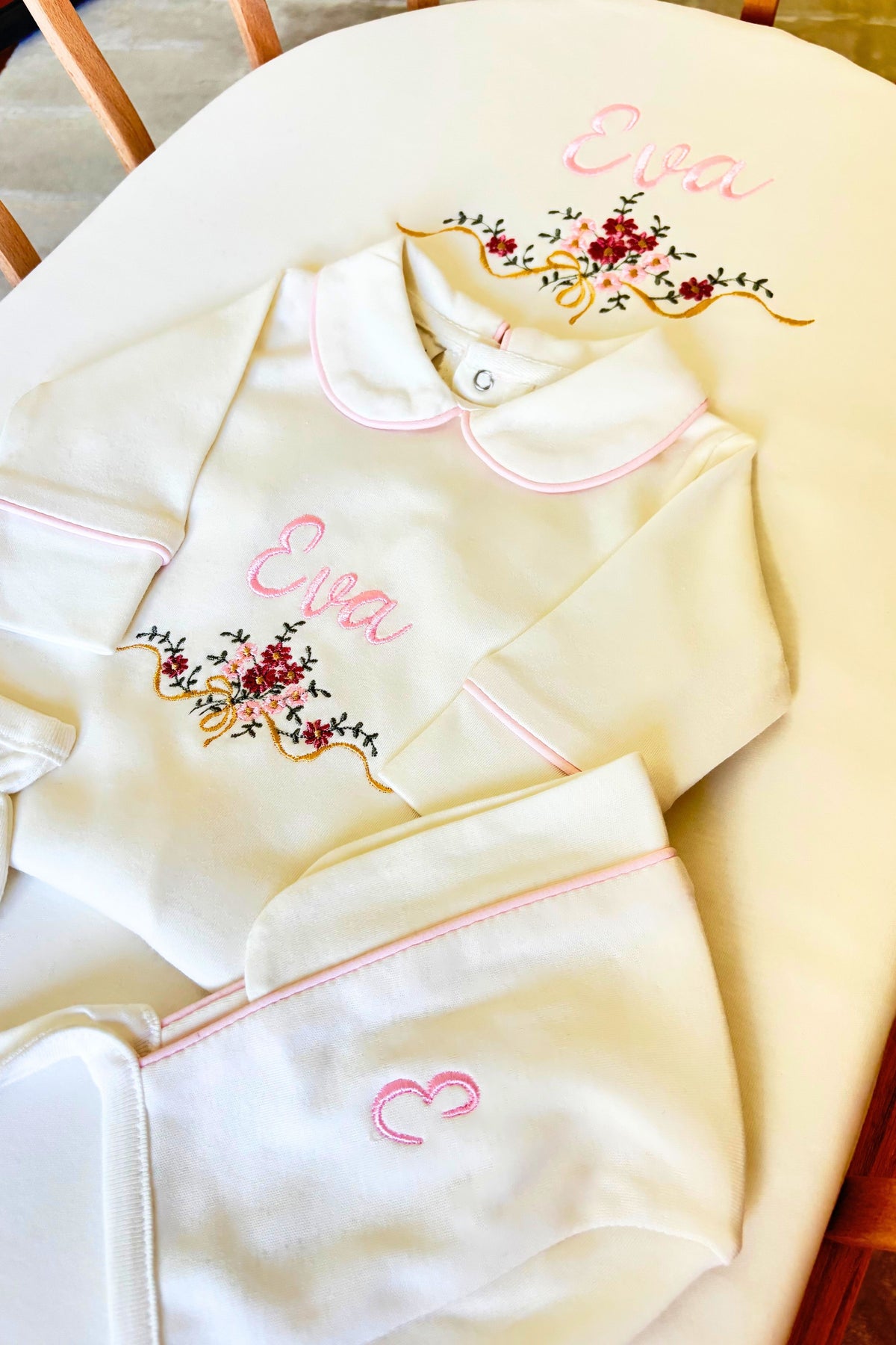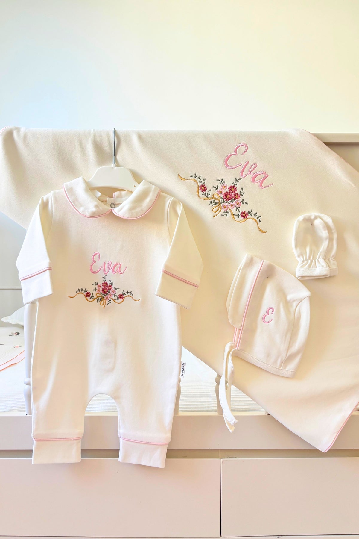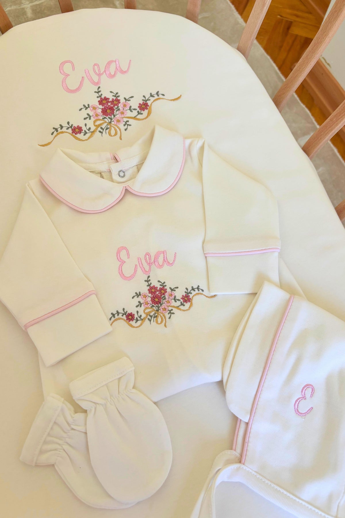 Çiçekli İsim Nakışlı 6'lı Bebek Tulum Seti - %100 Pamuk Bebeğe Özel Yeni doğan Tulumu, Battaniye, Yastık, Şapka, Eldiven, Puset Örtüsü
