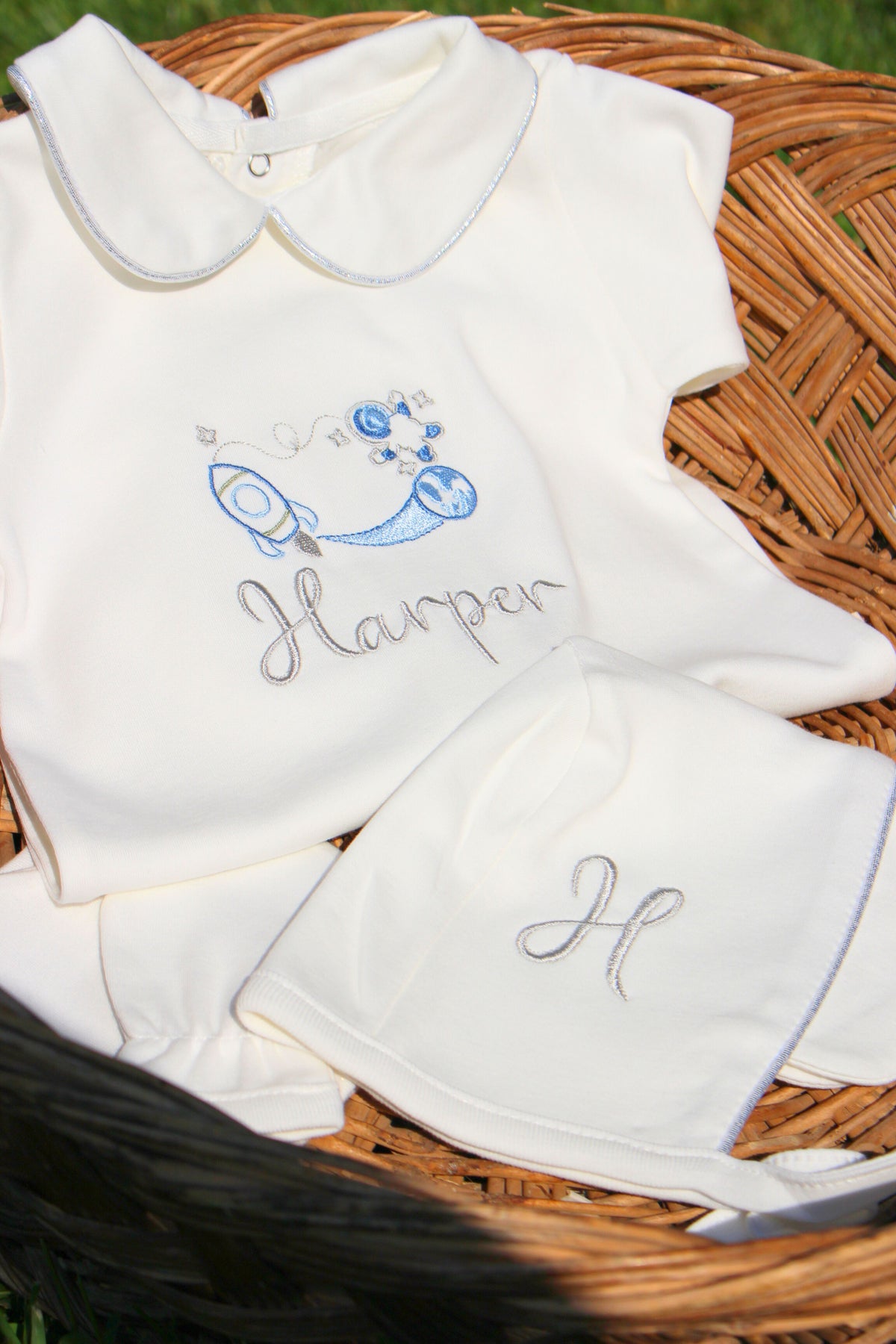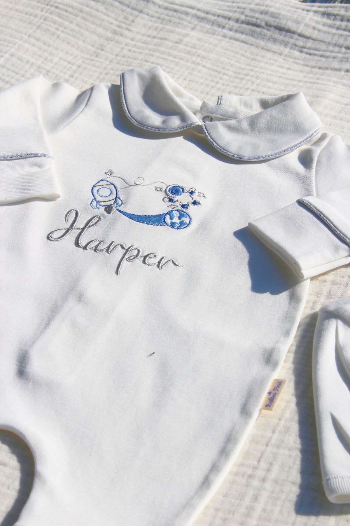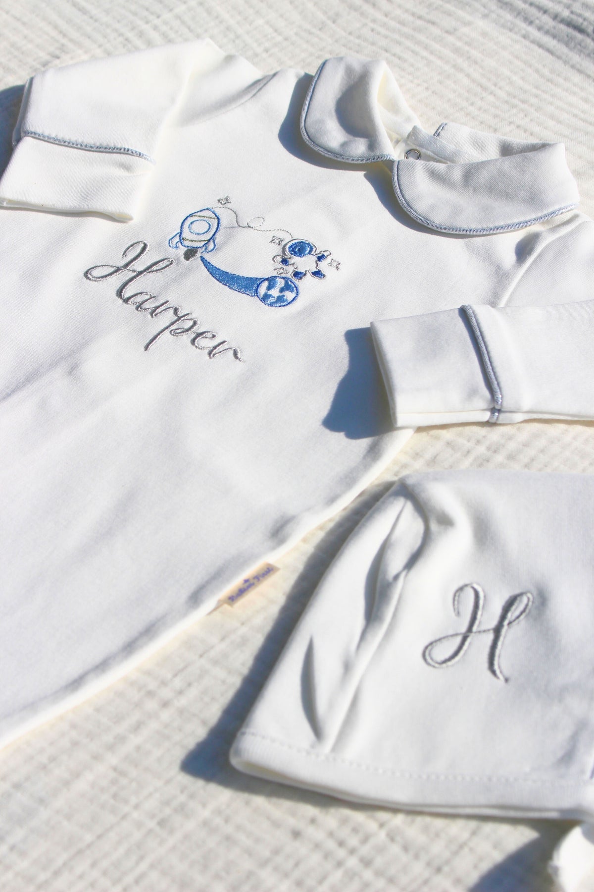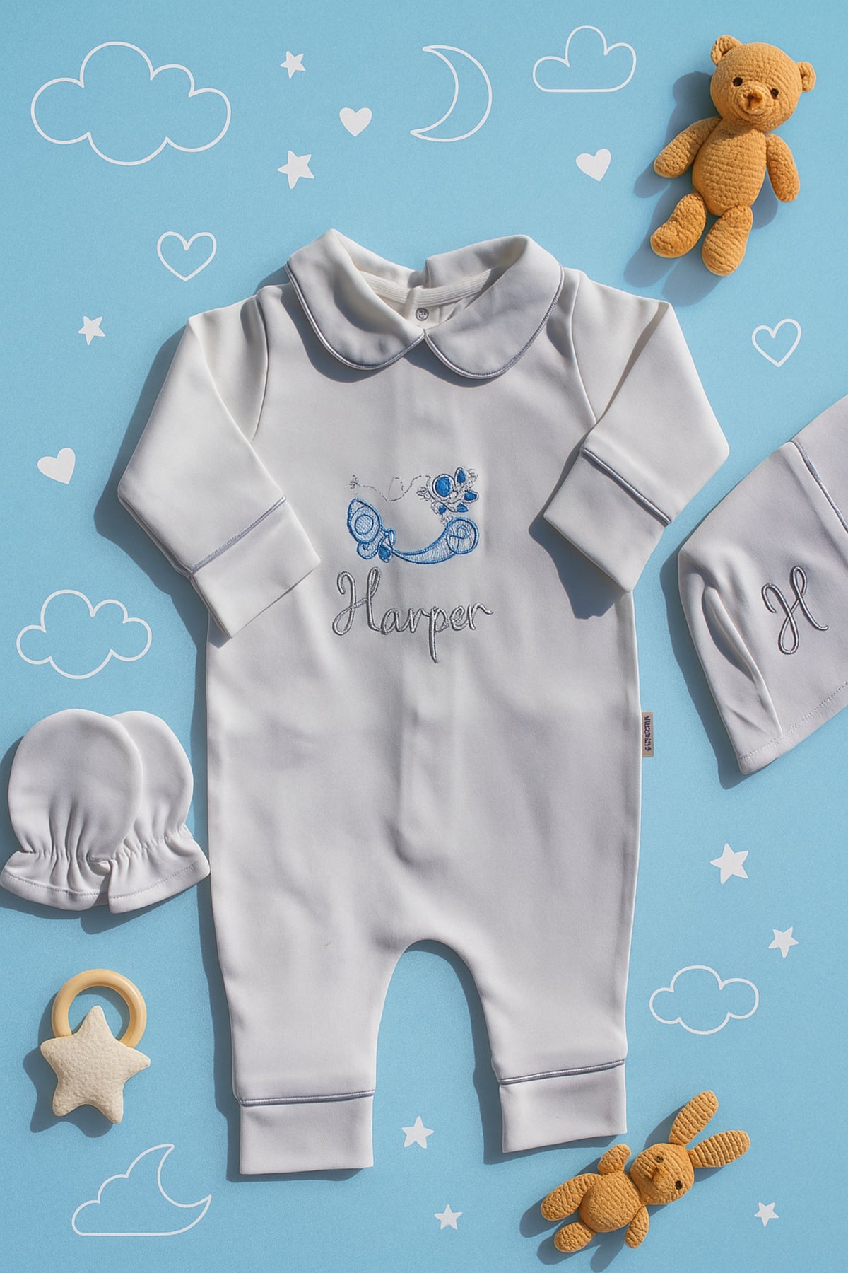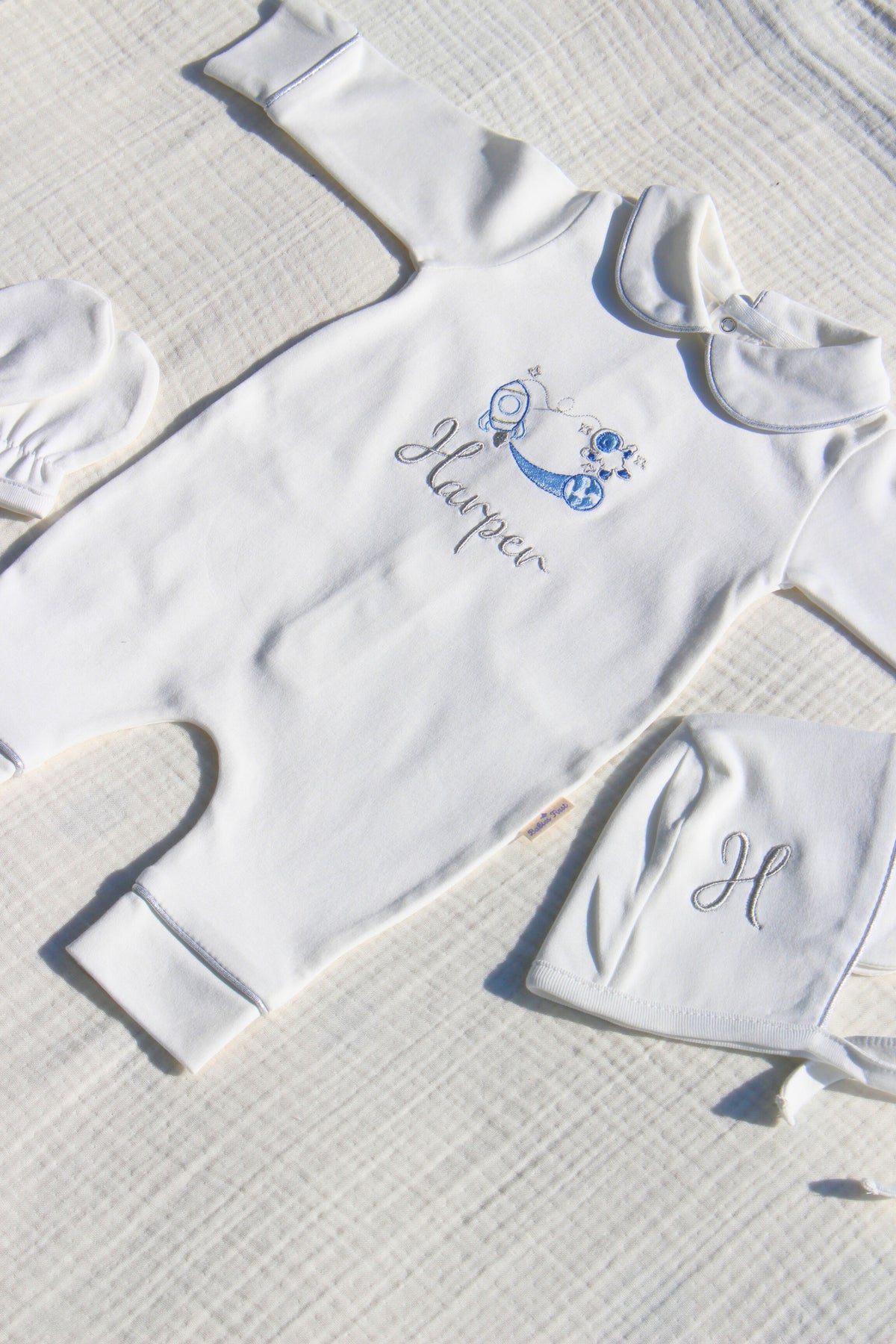 Erkek Bebek İsimli Hastane Çıkışı 5'li Set | Uzay Nakışlı %100 Pamuk Bebeğe Özel Yeni doğan Tulumu, Yastık, Şapka, Eldiven, Puset Örtüsü