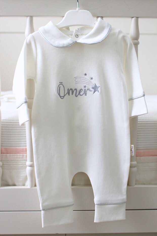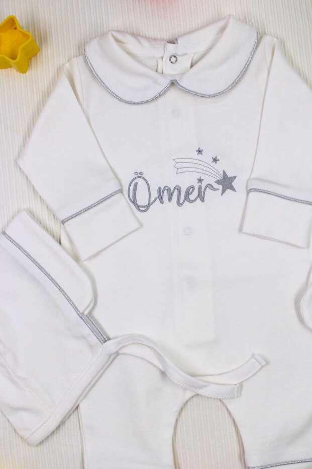 Gümüş Detaylı Kişiye Özel 5'li Bebek Tulum Seti – Yeni doğan Hastane Çıkışı, Şapka, Eldiven, Battaniye, Puset Örtüsü, Tulum, Yastık