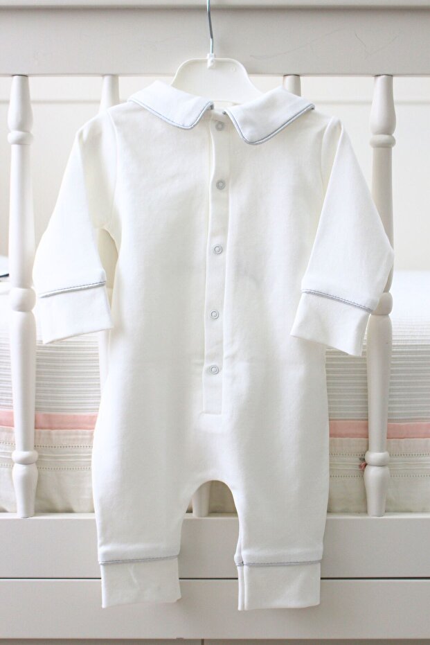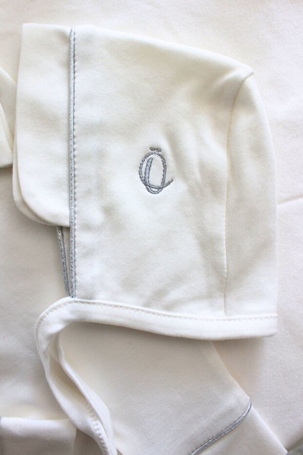 Gümüş detaylı 3'lü Bebek Tulum Setimizle minik bebeğinizin ilk kıyafetini unutulmaz hale getirin! Yumuşacık ve nefes alabilen pamuktan üretilen bu özel set, tulum, şapka ve eldivenden oluşur.