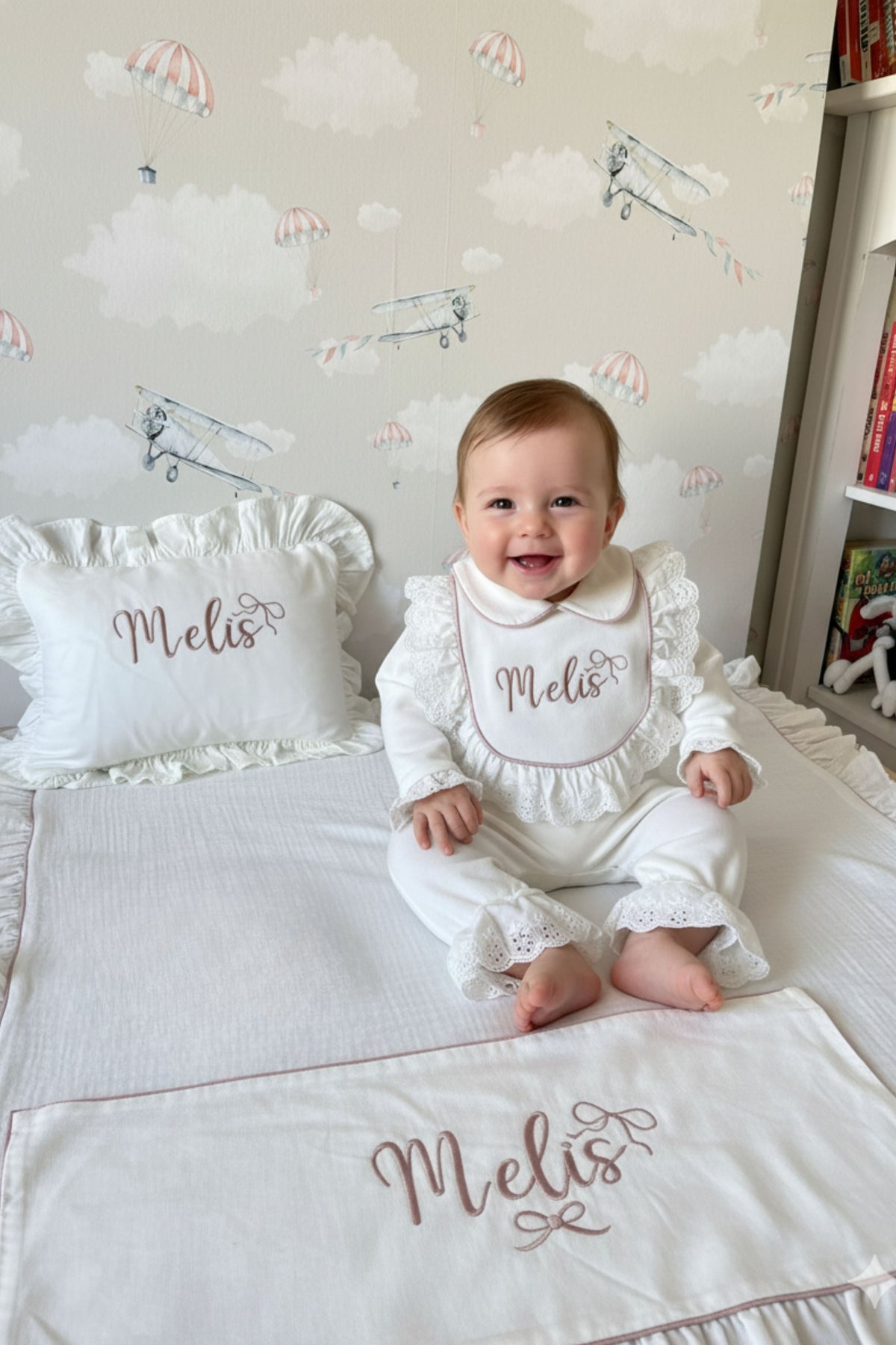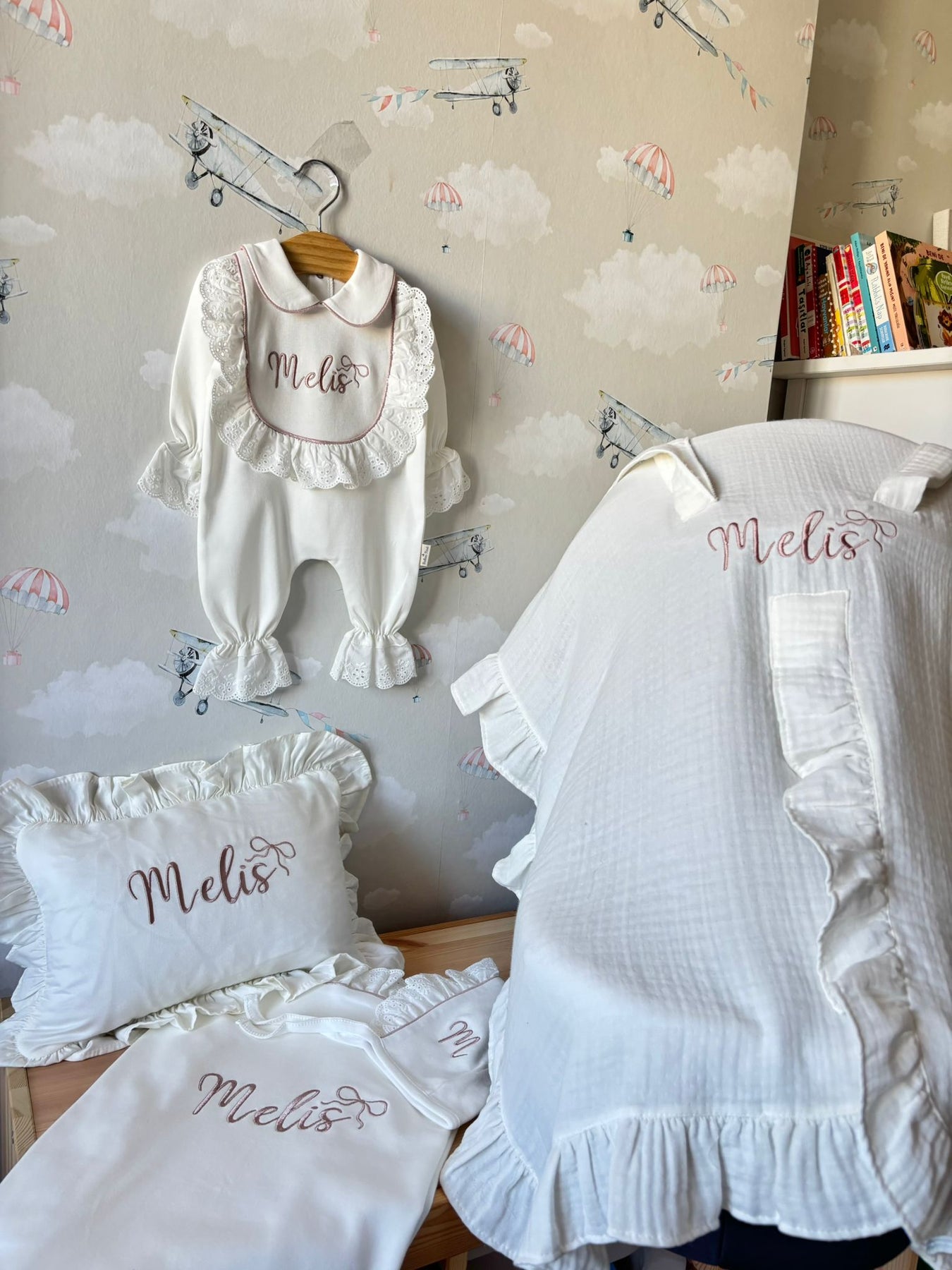 İsme Özel Nakışlı Fırfırlı 6’lı Yeni Doğan Bebek Seti – Tulum, Battaniye, Yastık, Şapka, Eldiven, Puset Örtüsü