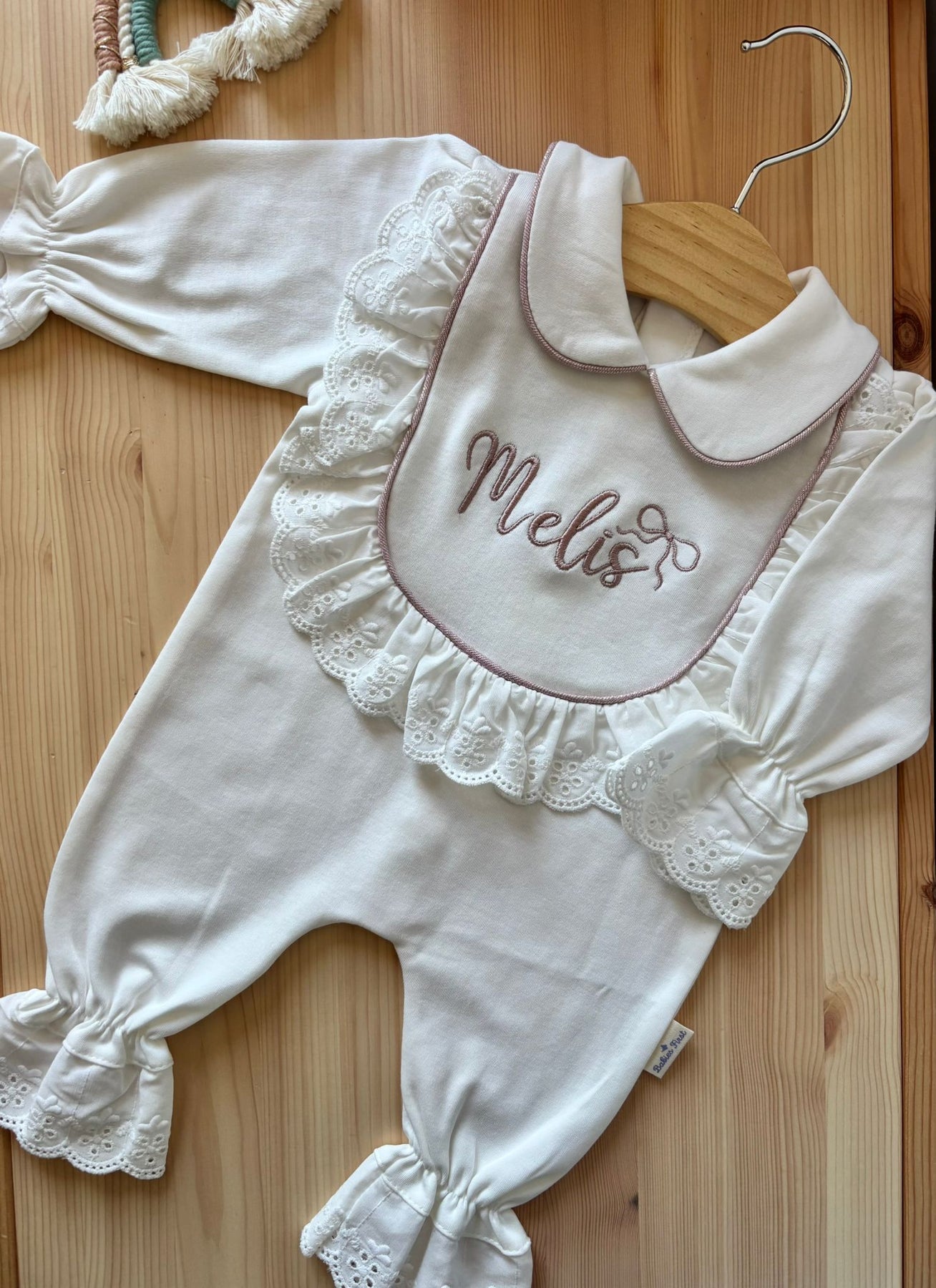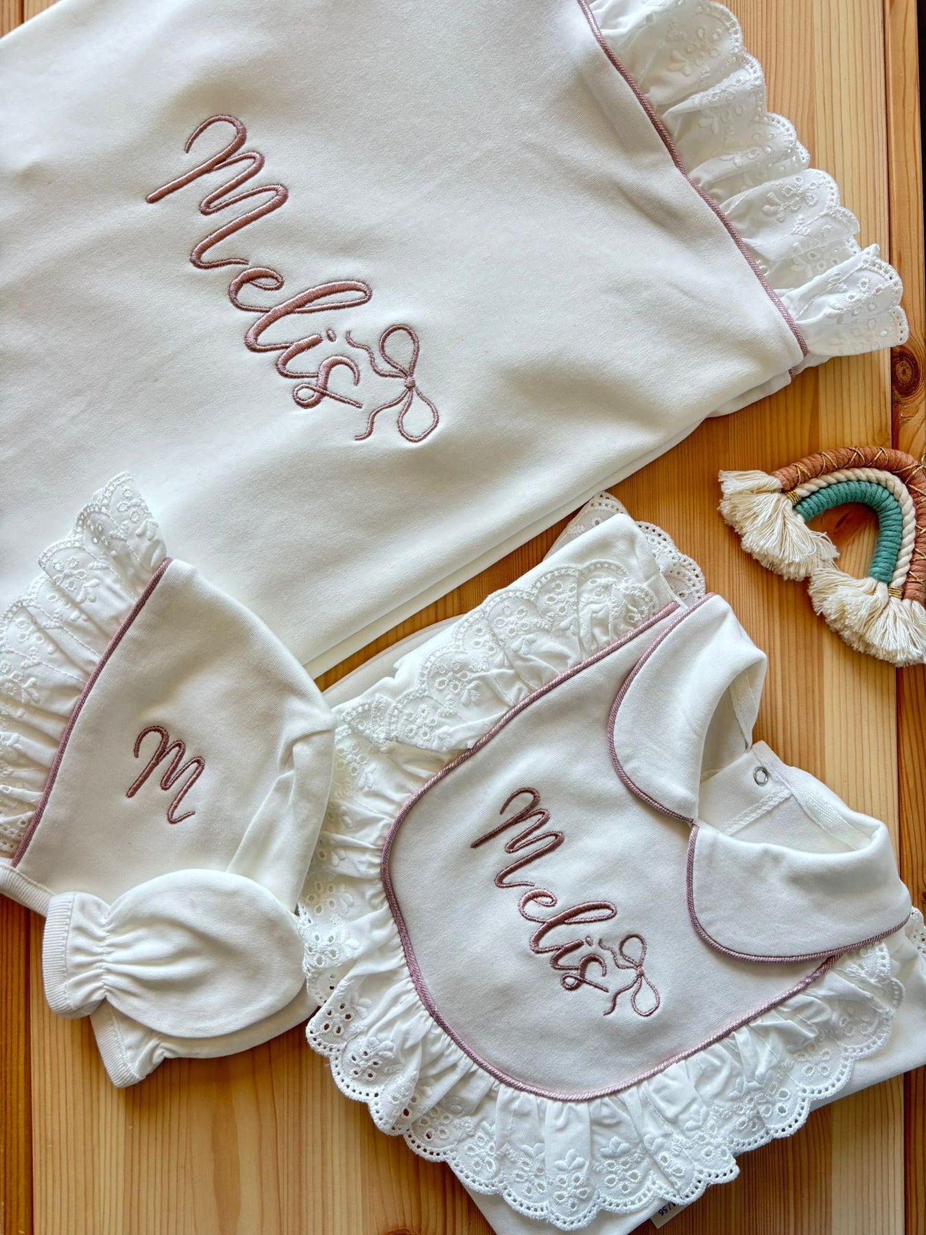 Bebeğinizin ismine özel olarak işlenen şık nakış detayları, bu seti unutulmaz bir hatıraya dönüştürüyor.